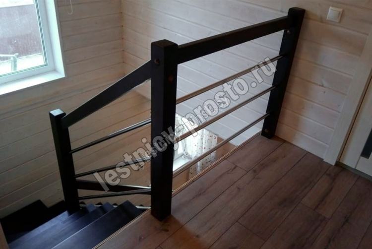 В комплекте: 3 прямых столба и профильный поручень без покрытия, комплект из 3 ригелей из стали (окрашены в цвет каркаса или хром по желанию) диаметром 12 мм. Ограждение начинается со второй ступени.
