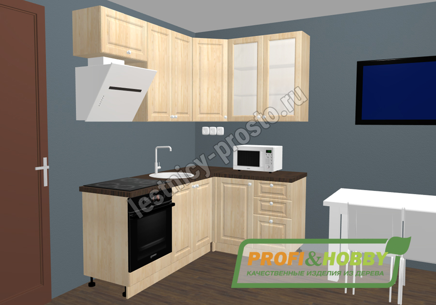 Угловой кухонный гарнитур из 100% массива сосны размером 2 на 1,4 и высотой 2,32 м (в данном проекте использованы высокие верхние ящики 90 см). Цвет на выбор - 27 вариантов (при заказе кухни в нашем интернет магазине просьба указывать название цвета в комментариях).