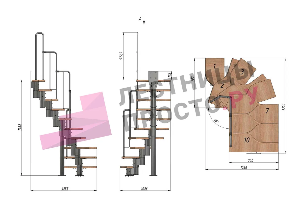 Лестница Prosto Urban Black гусиный шаг 700 мм, h180-264 см (10 ступеней), дуб