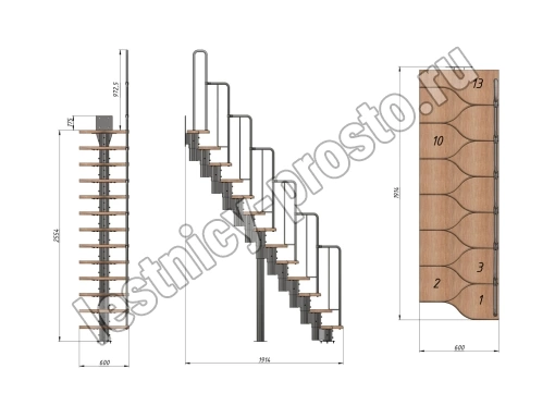 Лестница Prosto Urban Black гусиный шаг 600 мм, h234-336 см (13 ступеней), бук