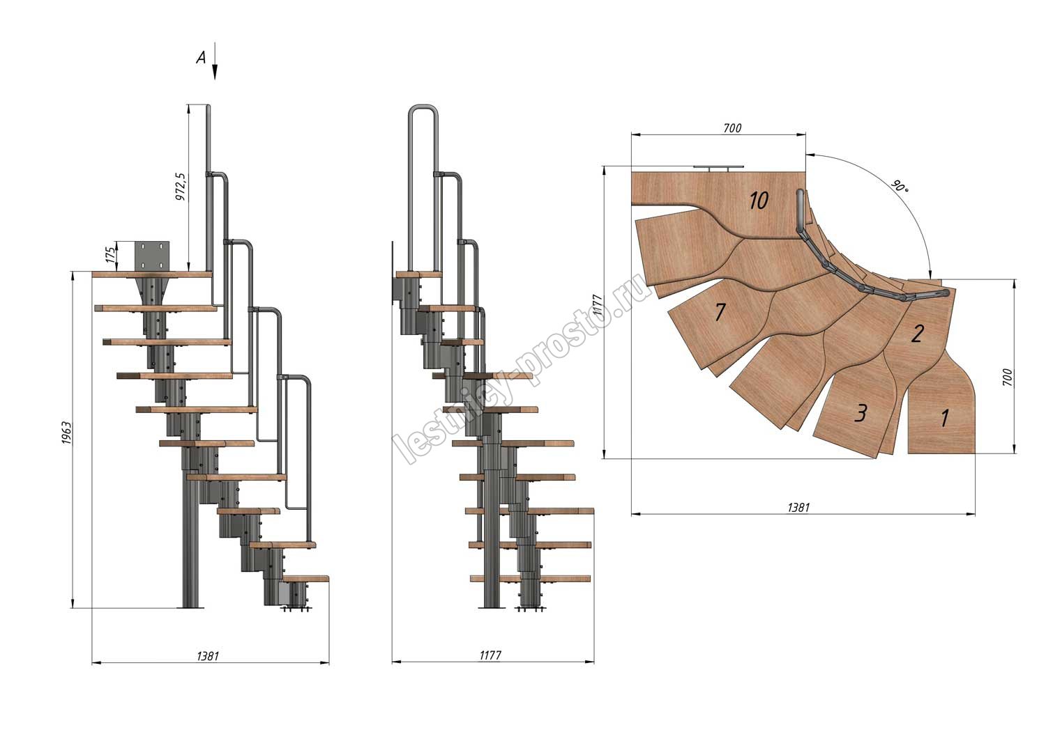 Лестница Prosto Urban White гусиный шаг 700 мм, h180-264 см (10 ступеней), дуб
