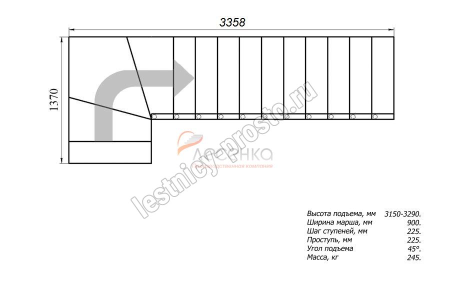 Модульная лестница Фаворит 225 3150-3290, Серый, Лиственница, Крашеная