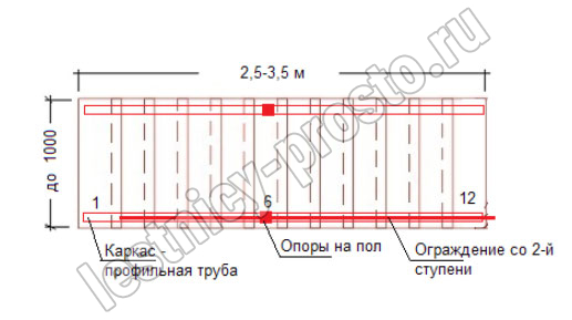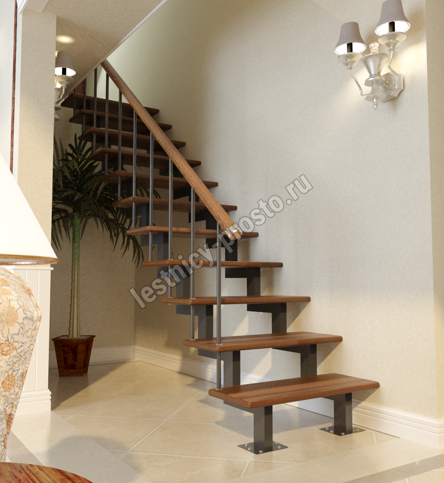 В основе конструкции прямой лестницы PROSTO Double усиленный каркас из профильной трубы 50×100 мм, представляющий собой 2 параллельных цельносварных косоура с двумя опорами на пол.